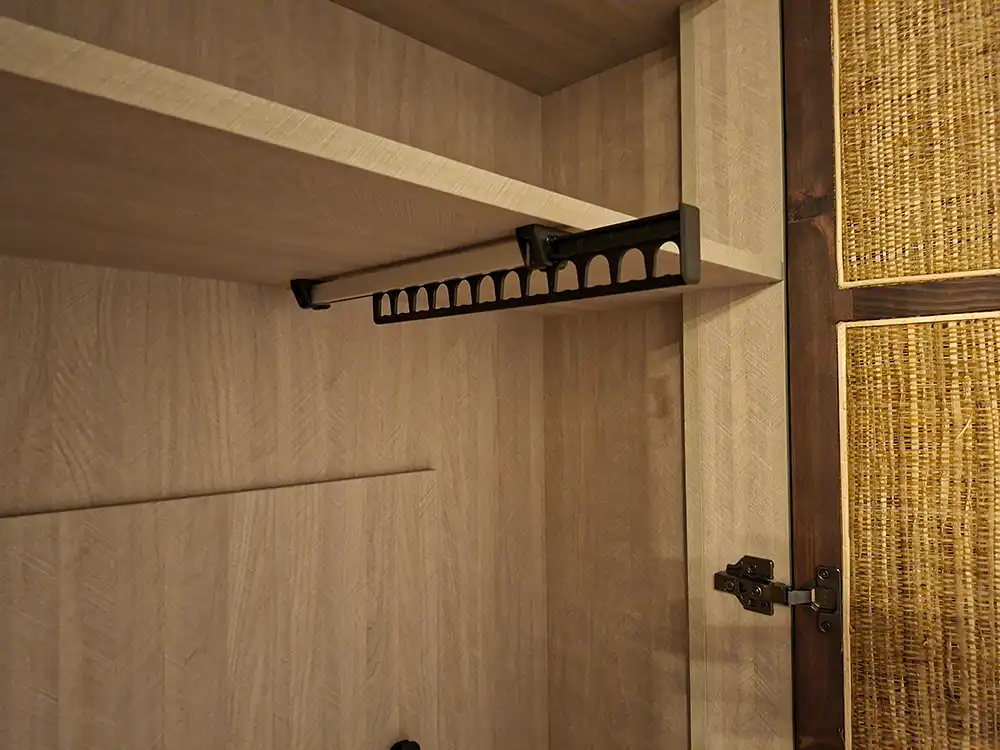 - Uso de materiales: Puertas de Pino tintado y rejilla de ratán natural.