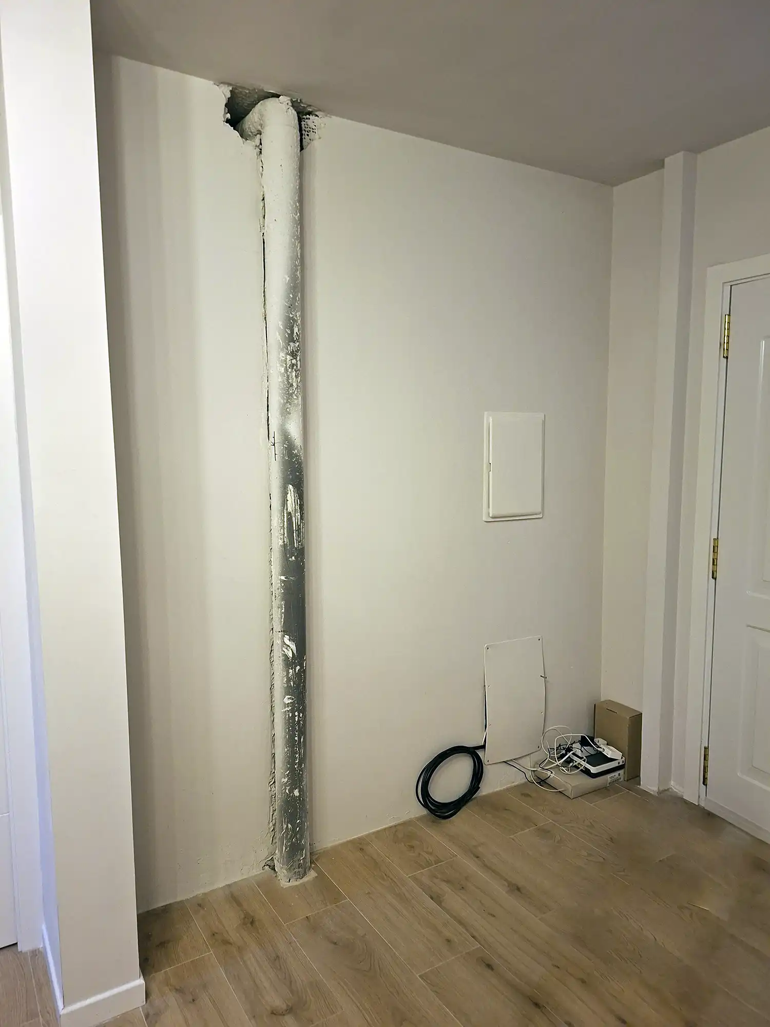 Tras definir la estética, abordamos un desafío crítico: la existencia de una tubería tras la ubicación del armario. La clienta especificó que no se podía perder el acceso a esa zona ante una posible rotura, por lo que el diseño debía prever una solución de registro. Cerramos la cita con una toma de medidas exhaustiva de cada rincón y del posicionamiento exacto de dicha instalación para trasladar todo el proyecto a nuestra oficina técnica.